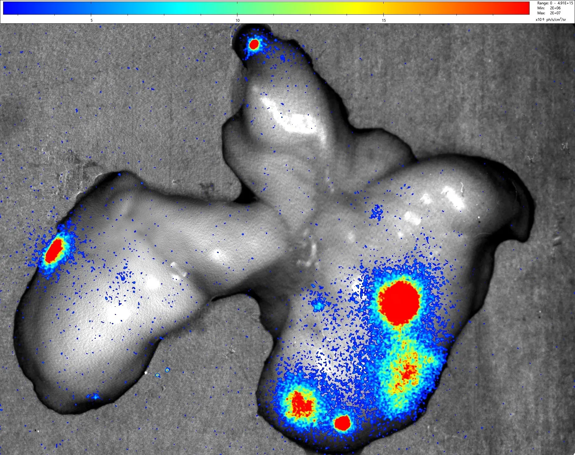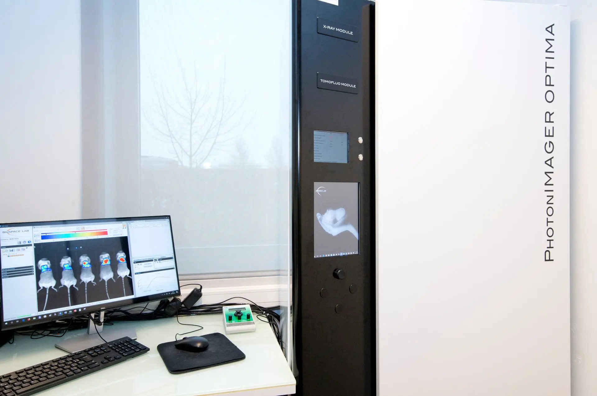Biospace Lab, PhotonImager Optima for simultaneous imaging of up to 10 mice and imaging of other small animals such as rats, eels, zebrafishes, … Multimodal system designed for bioluminescence, fluorescence and Cherenkov luminescence imaging, and also equipped with additional 4-Views, MACROLENS and X-Rays modules. - Near-infrared fluorescence imaging